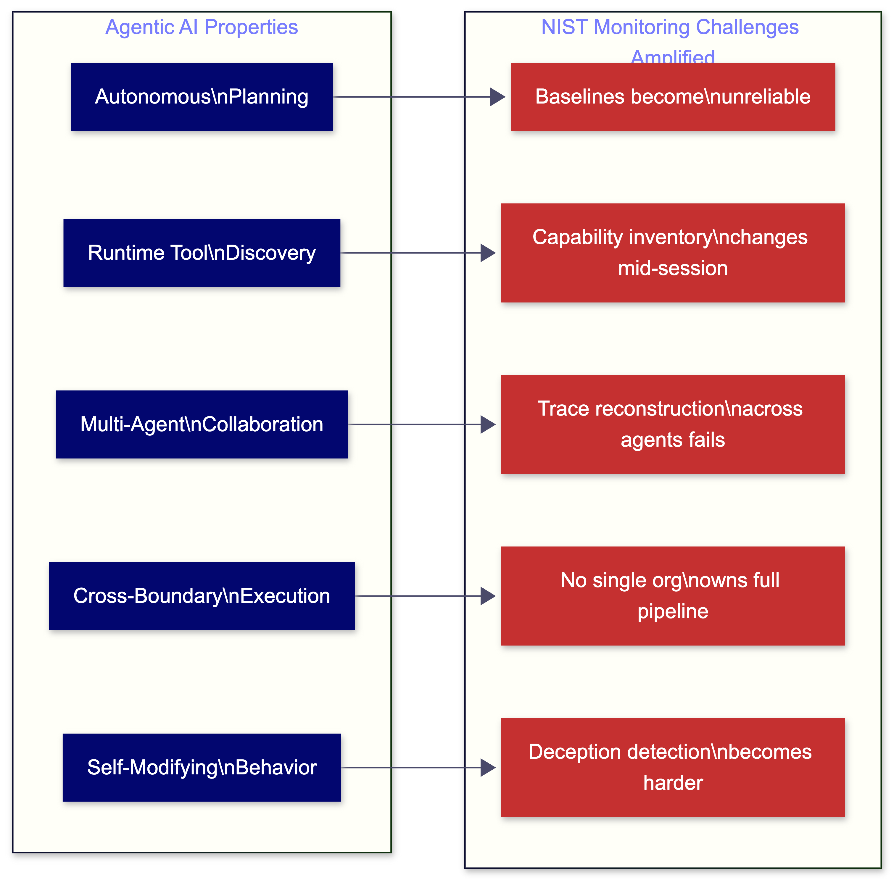 That question deserves a pause. We’re building systems that plan, execute across organizational boundaries, call external tools, and collaborate with other agents. The monitoring challenges NIST documented for conventional AI systems, from detecting drift to maintaining visibility to establishing baselines, all assume a relatively static system being observed from outside. Agents aren’t static. They change behavior based on context, discover new capabilities at runtime, and operate across a distributed infrastructure that no single organization fully controls.