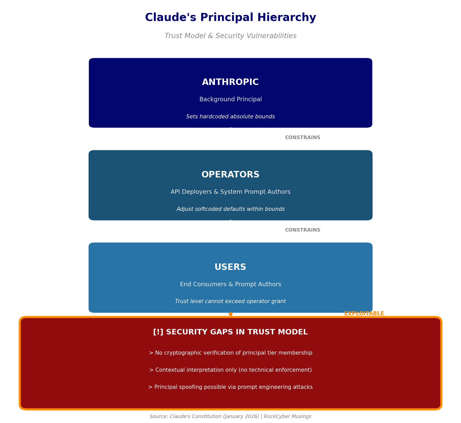 Consider LLM01: Prompt Injection. Standard mitigations include input validation, privilege separation, and output filtering. Claude’s constitution adds a wrinkle. The document explicitly describes a three-tier trust model where Anthropic sits at the top, operators (API deployers) in the middle, and users at the bottom. No cryptographic mechanism enforces these boundaries. Claude is instructed to be “suspicious of unverified claims” about trust levels, but suspicion is not authentication.