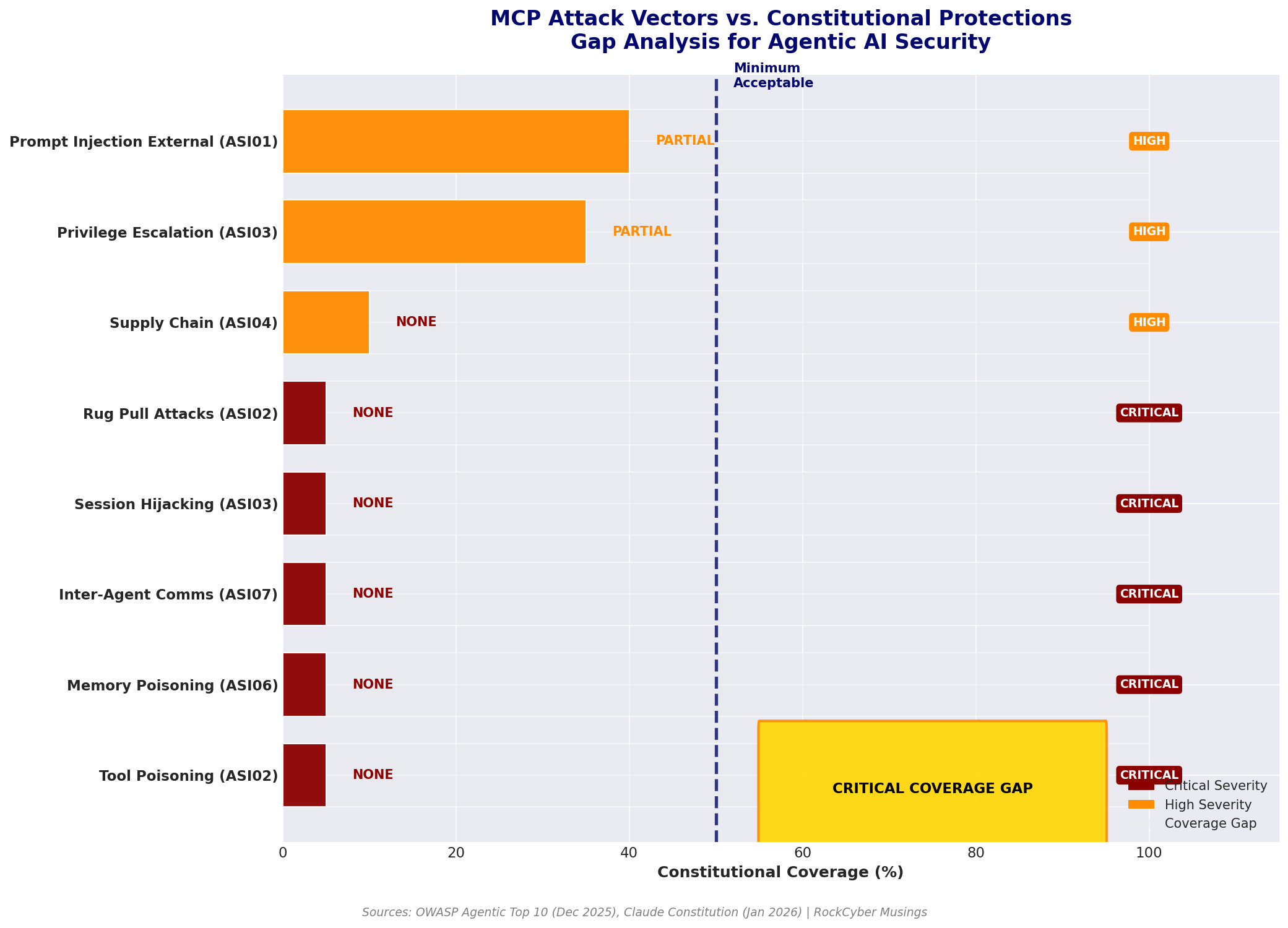 The OWASP Agentic Top 10 addresses ASI06: Knowledge Poisoning and ASI07: Insecure Inter-Agent Communication. Claude’s constitution provides no guidance for these scenarios. When a malicious MCP server sends Claude poisoned tool metadata, the constitution’s principal hierarchy can’t help because the attack bypasses the instruction path entirely.