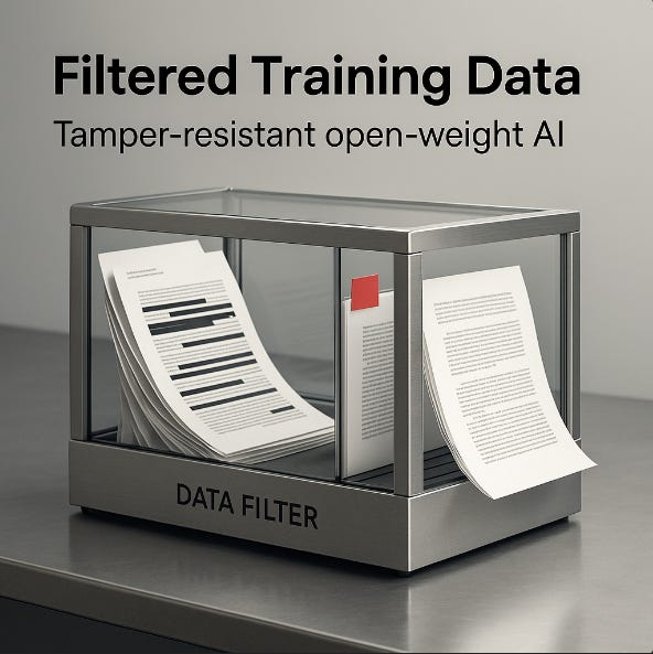 Filtered training data is the first scalable path to tamper-resistant open-weight AI, especially when paired with Circuit-Breaking and retrieval governance.