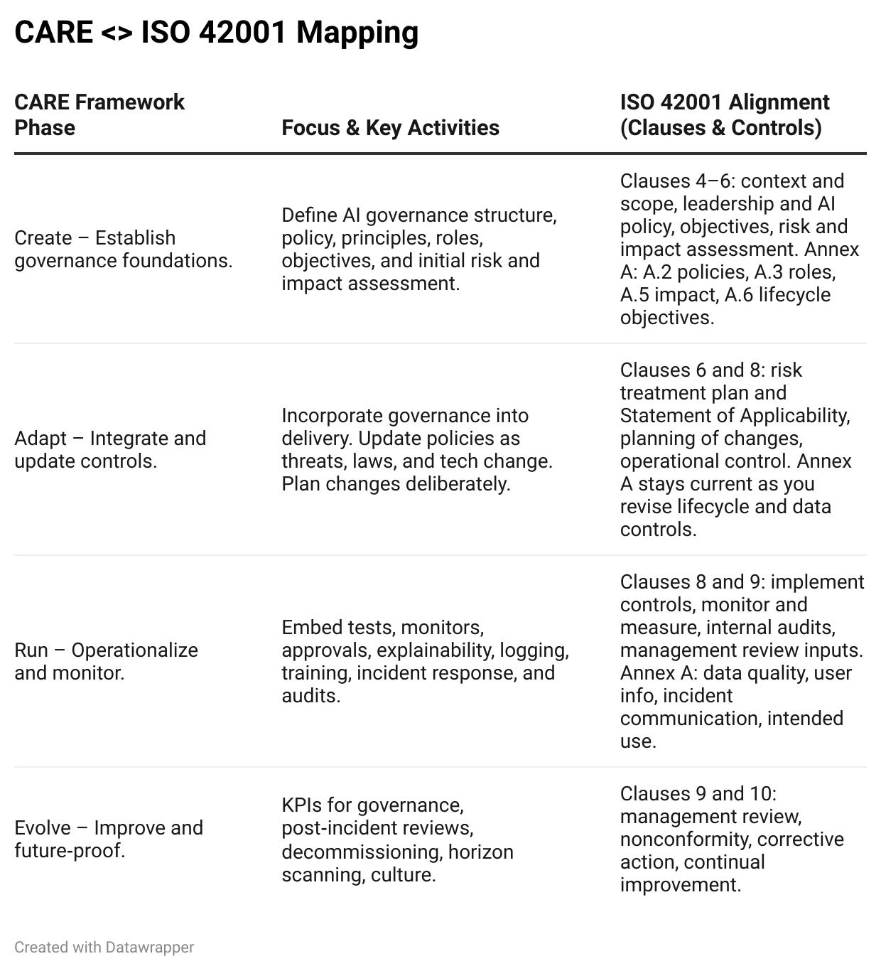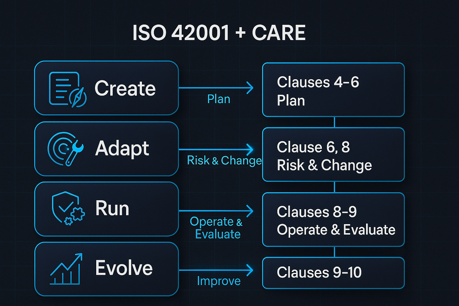 We are implementing the CARE framework as the operating model that brings ISO 42001 to life in production.